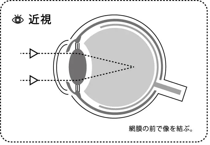 近視とは、映像が網膜の手前で焦点を結んでしまう状態で、近くの物体を見るときにはピントが合いますが、遠くの物体はピントが合わずぼやけて見えます。