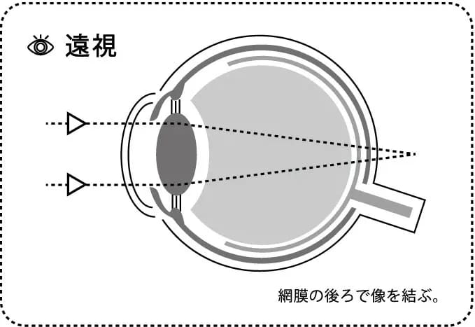遠視とは、映像が網膜の後方で焦点を結んでしまう状態で、遠くの物体を見るときには調節力が働く範囲で見えますが、近いところでは調節力が不足し見えません。老眼が進むと、調節力が衰えるため、近くだけでなく遠くまで見えづらくなってきます。