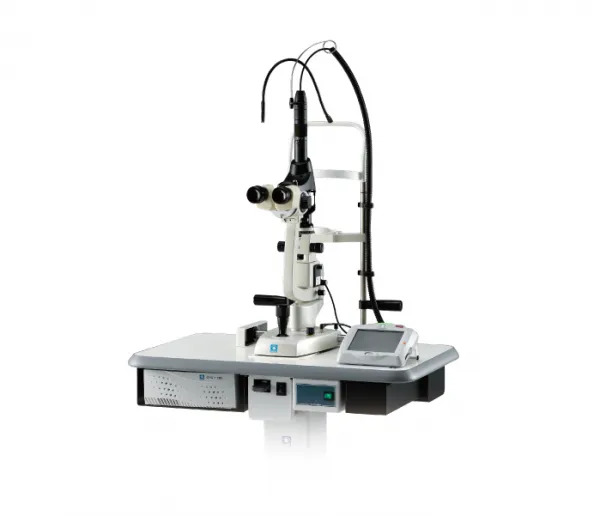 - レーザー治療は、眼科で使用する治療台にお顔をのせていただき、目の上にコンタクトレンズをのせて、治療します。通常5分から10分程度の治療です。 レーザー照射中、一時的なまぶしさと目の奥に鈍痛を感じます。これは、目の奥で熱が発生することによるもので、これにより網膜の新生血管を予防したり、網膜剥離の場合は網膜が接着され、治療効果が生まれます。