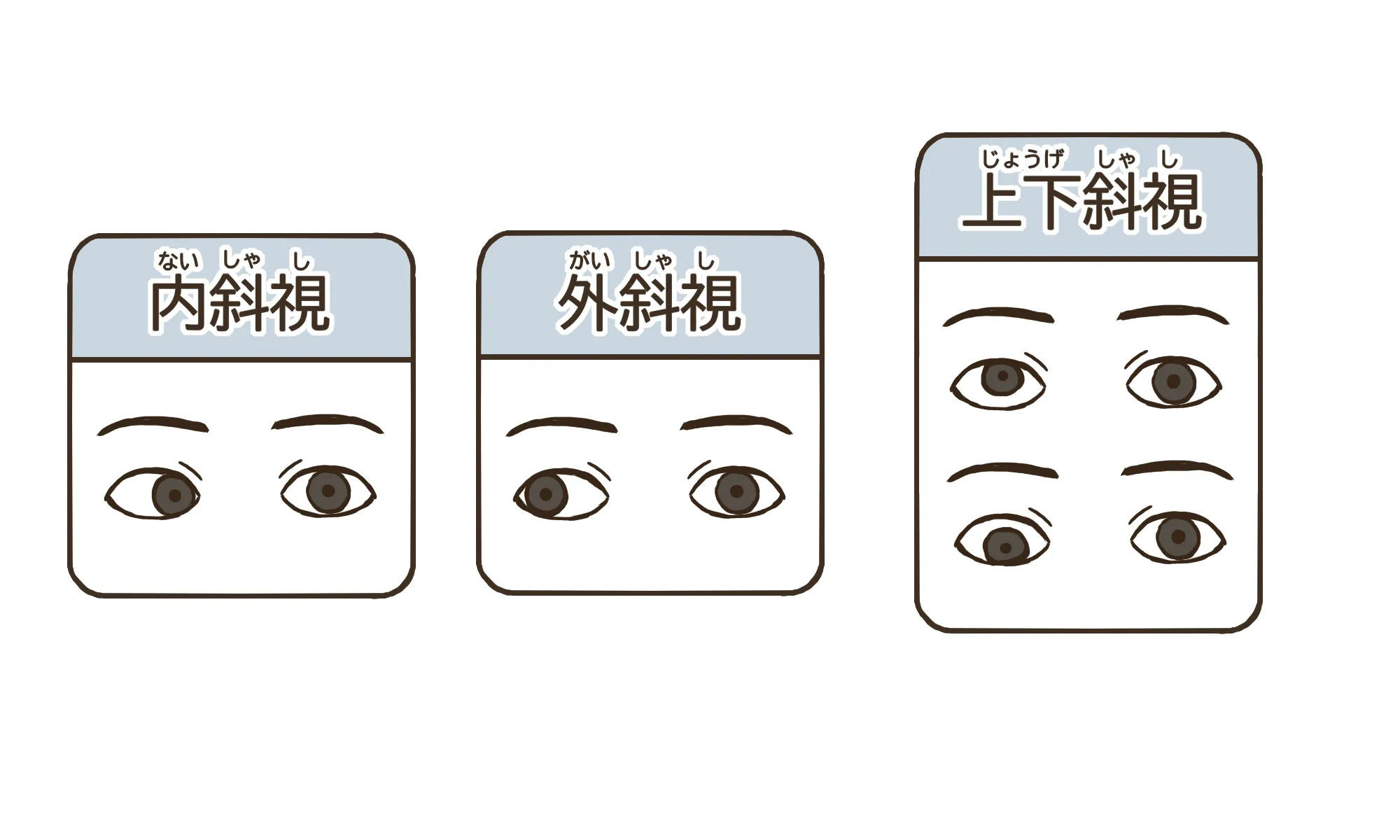 斜視とは、物を見るときに、片方の眼が他を向いてしまっている状態です。疲れたときや意識していないときのみ眼の位置が外れるものは間欠性斜視といいます。内斜視、外斜視・上下斜視などがあり、診察にて優位眼・交代視・斜視角・ずれる頻度・屈折異常・脳疾患などが隠れていないを確認していきます。斜視の手術が必要な場合は、専門治療のできる病院をご紹介致します。